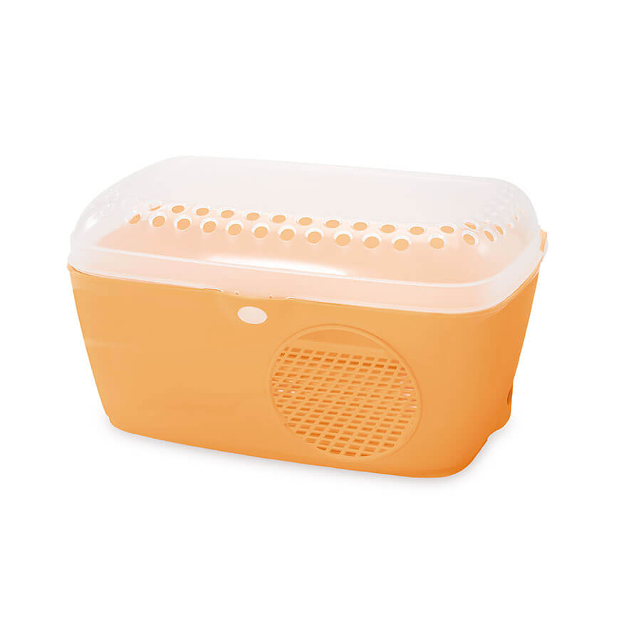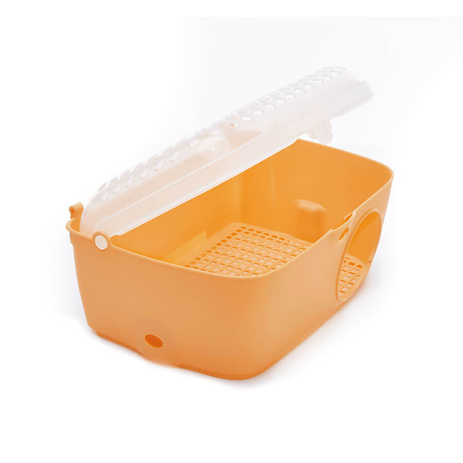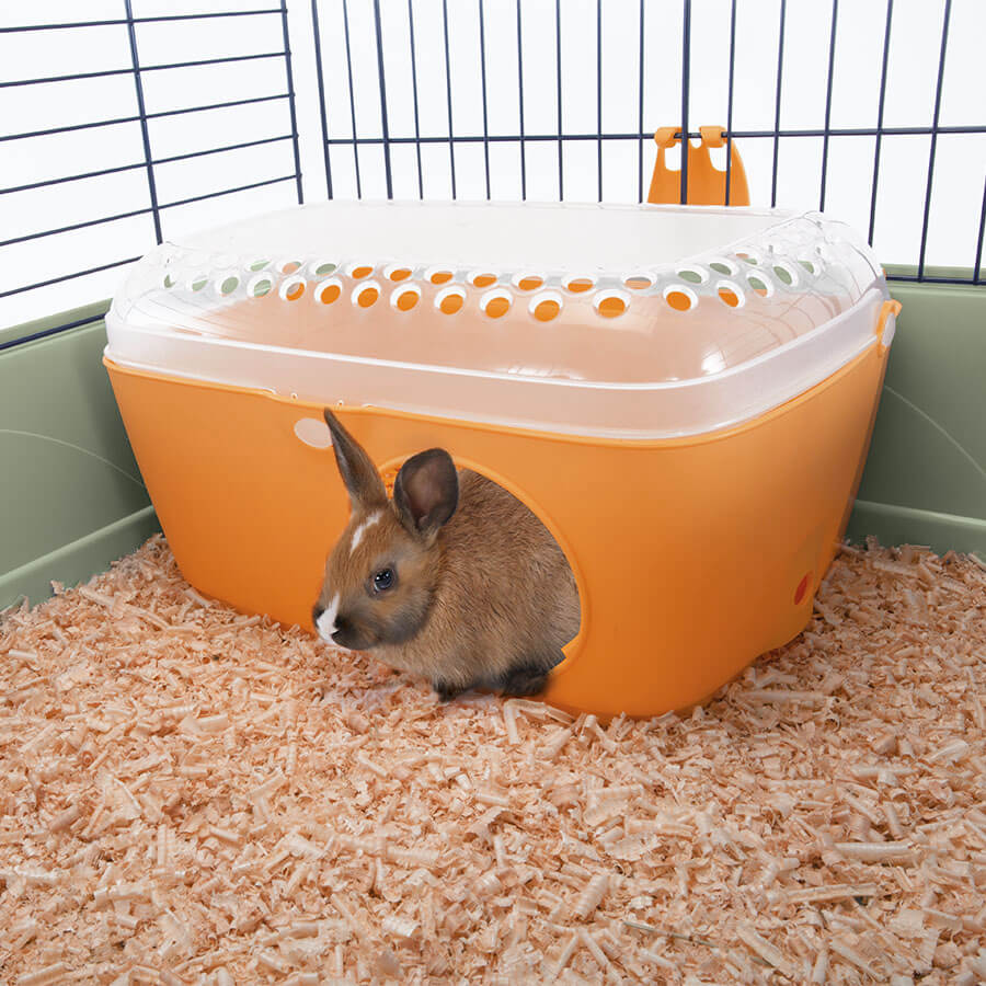 Alcova is a comfortable house designed to be placed inside any cage for rabbits, guinea pigs, chinchillas, or ferrets, creating a private space to ensure relaxation and comfort. This house features a transparent, openable roof for easy observation of your rodent, and a floor with a drainage grid to allow waste to fall through, keeping the environment clean.