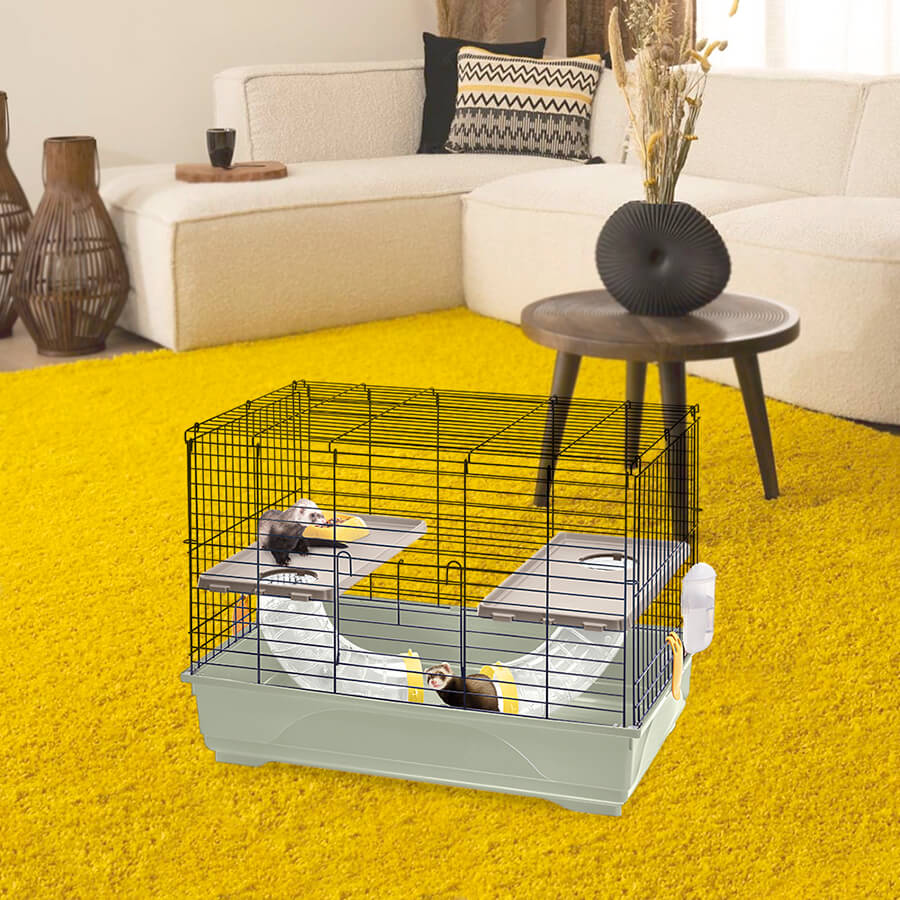 To keep your ferret in top shape, IMAC presents Ferret Flat, a beautiful, sturdy, and well-equipped cage. The spacious plastic base is attached to the painted metal wire structure using two convenient clips. It is easy to access through a large side opening, making daily maintenance tasks hassle-free.