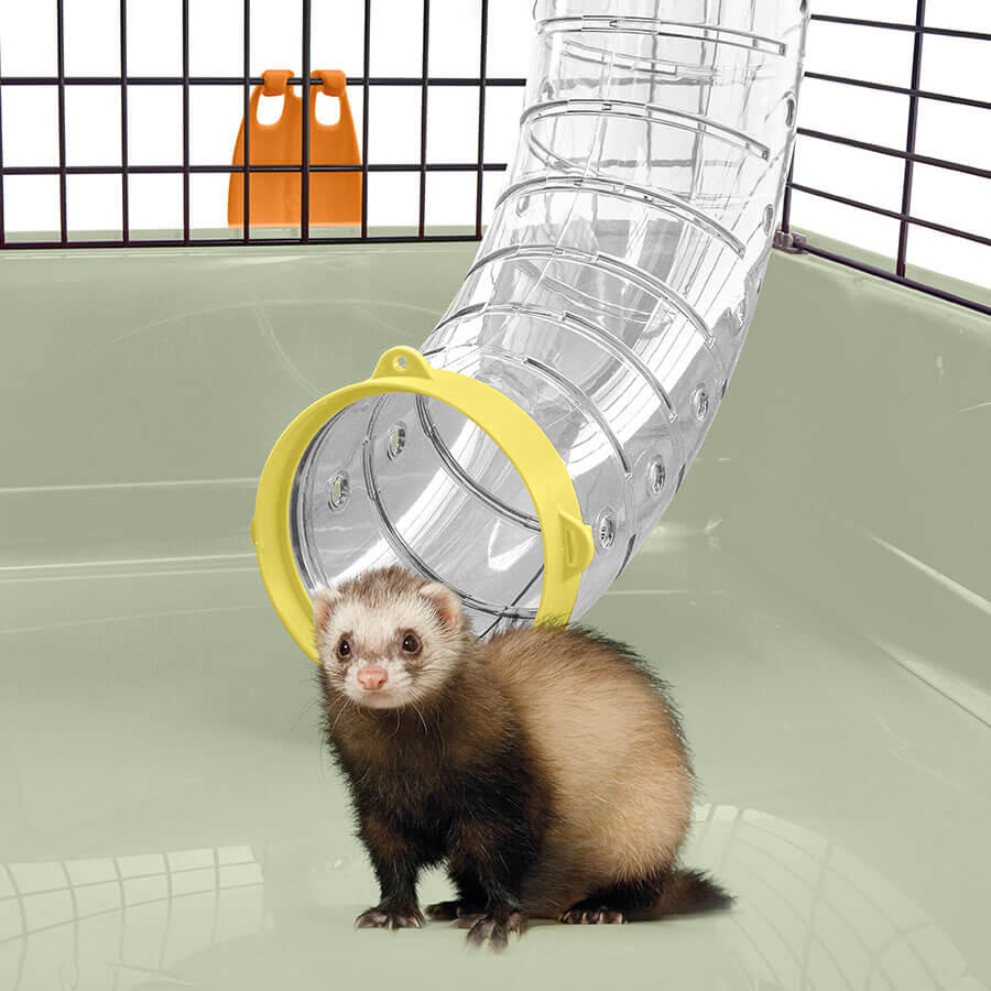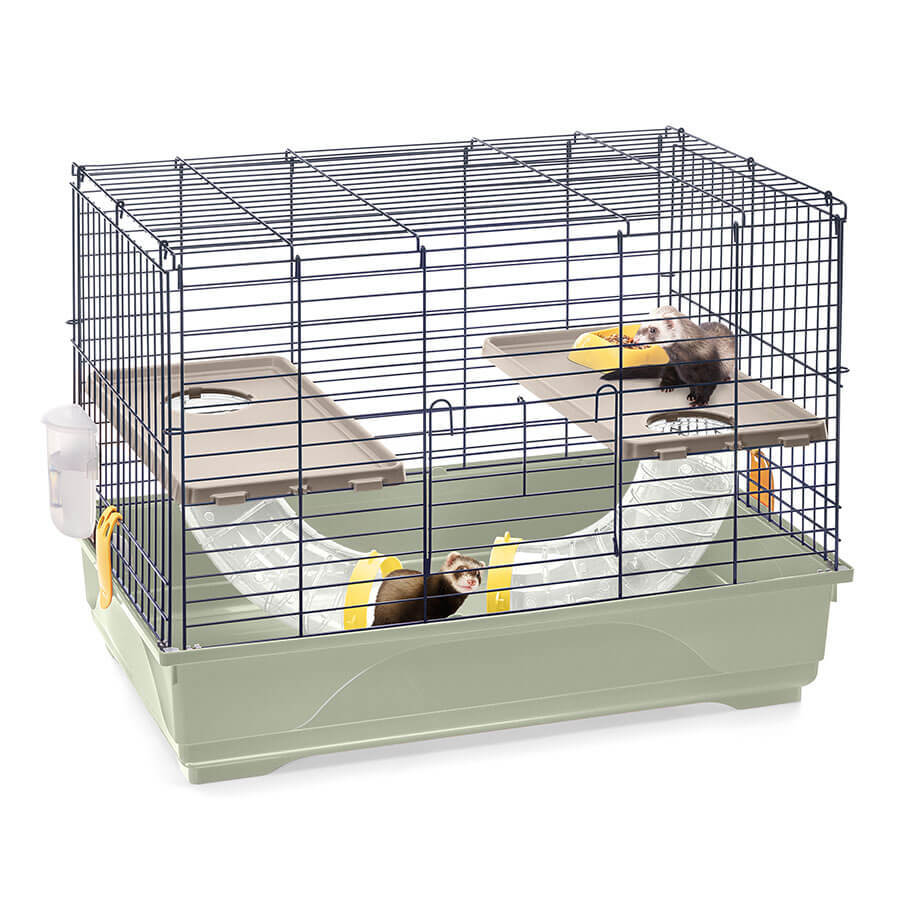 The cage includes two plastic shelves connected to the base by two Ferret Tube tunnels. Additional accessories include a Fun Bowl plastic bowl and the Bibber 400 water bottle. For ease of movement, the optional Portagabbie 80 stand in painted metal is available, allowing you to move the cage safely from one place to another thanks to the pivoting wheels. Ferret Flat is easy to assemble and designed with a space-saving system to reduce transport and storage costs.