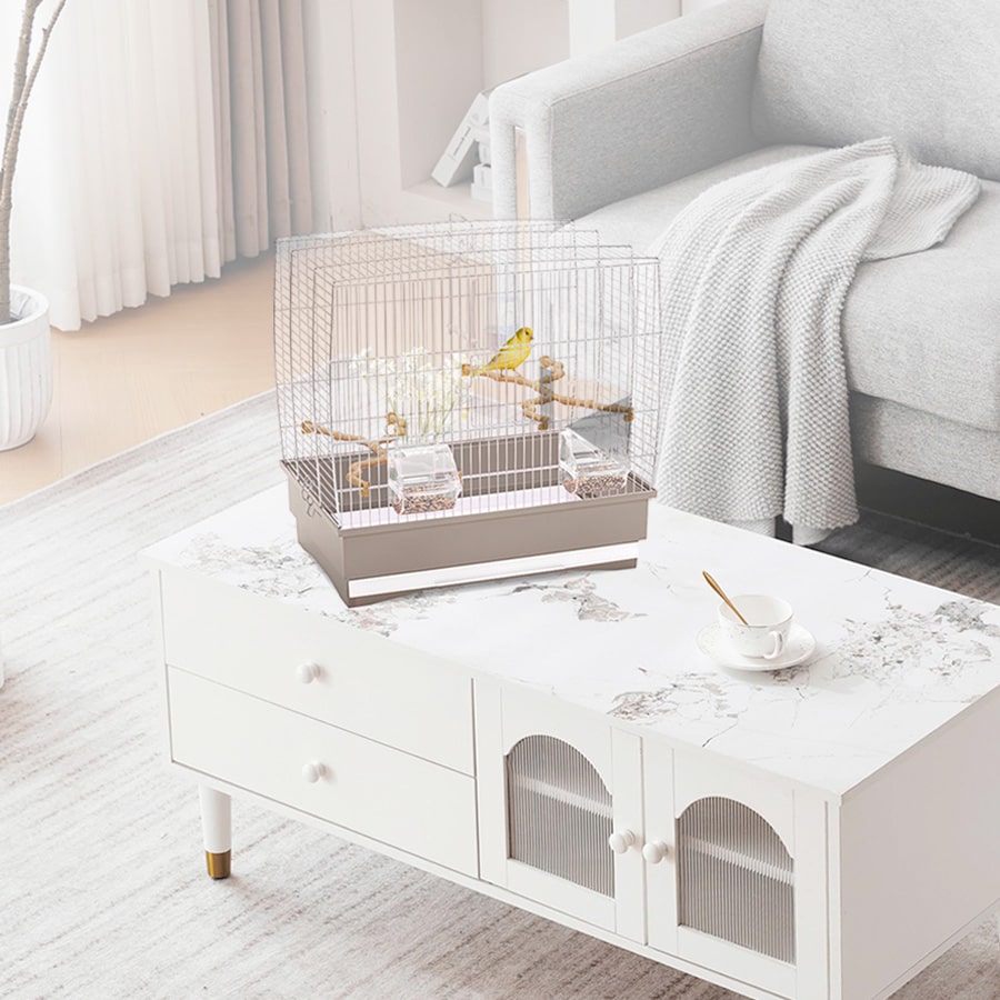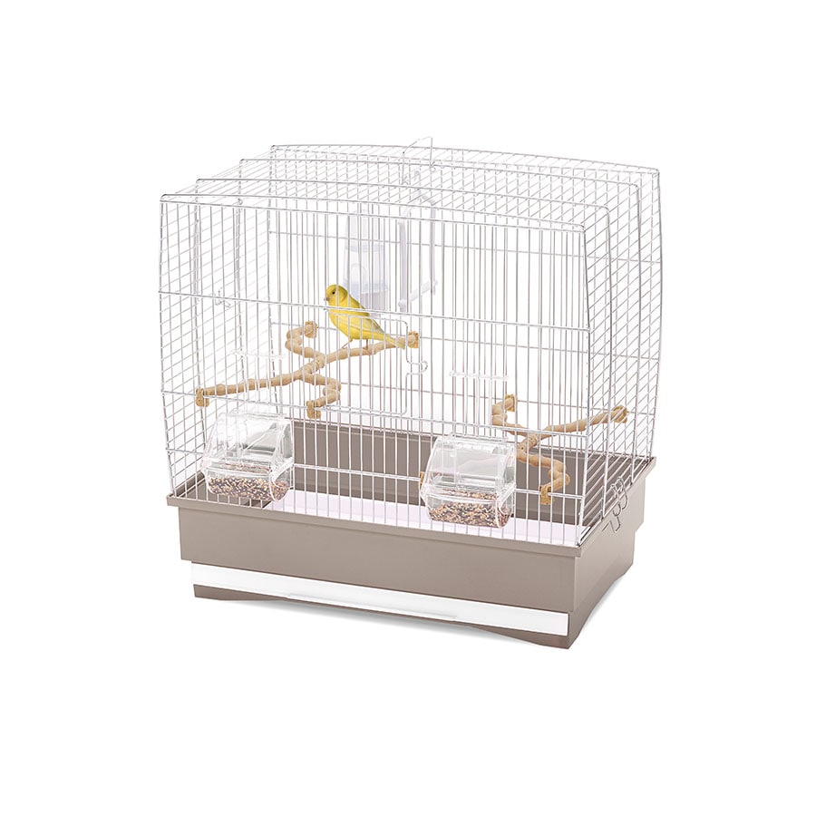 The Irene 2 cage is a rectangular model designed for canaries and small exotic birds. Its simple yet functional design includes all the essential accessories to create the perfect habitat for your feathered friends. It comes equipped with two transparent plastic Mia feeders, two branch-shaped perches, a Tweety 100 drinker, and a play swing. The removable drawer at the bottom allows for quick and easy cleaning. For maintenance, the cage features two openings: one at the front and one on the side, ensuring convenient access. Additionally, you can pair it with the optional Portagabbie 202 stand, which features swivel wheels for easy, effortless movement.