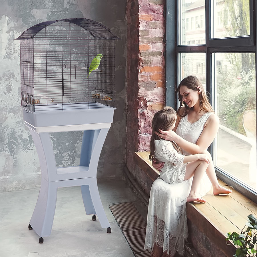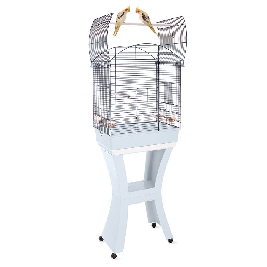 Calla, una bella gabbia per parrocchetti e calopsiti, a base rettangolare di ampie dimensioni, completa di Portagabbie in robusta plastica, abbinato al colore del fondo e dotato di ruote piroettanti per spostarla comodamente da un luogo all’altro. Caratteristica di questa gabbia è il tetto tondeggiante apribile e posizionando il posatoio tra le due aperture il vostro amico volatile sarà libero di svolazzare all’esterno e di ritornare alla base a suo piacimento. Calla diventa così un vero e proprio rifugio accogliente e sicuro e allo stesso tempo consente al vostro amico volatile di assaporare la libertà. Disponibile in varie colorazioni. Facile da pulire, grazie al comodo cassetto estraibile dal fondo che permette quotidianamente di rimuovere lo sporco. Completa di utili accessori come le quattro mangiatoie Parrot e i posatoi.