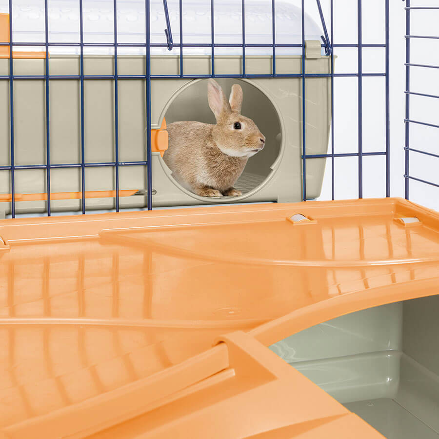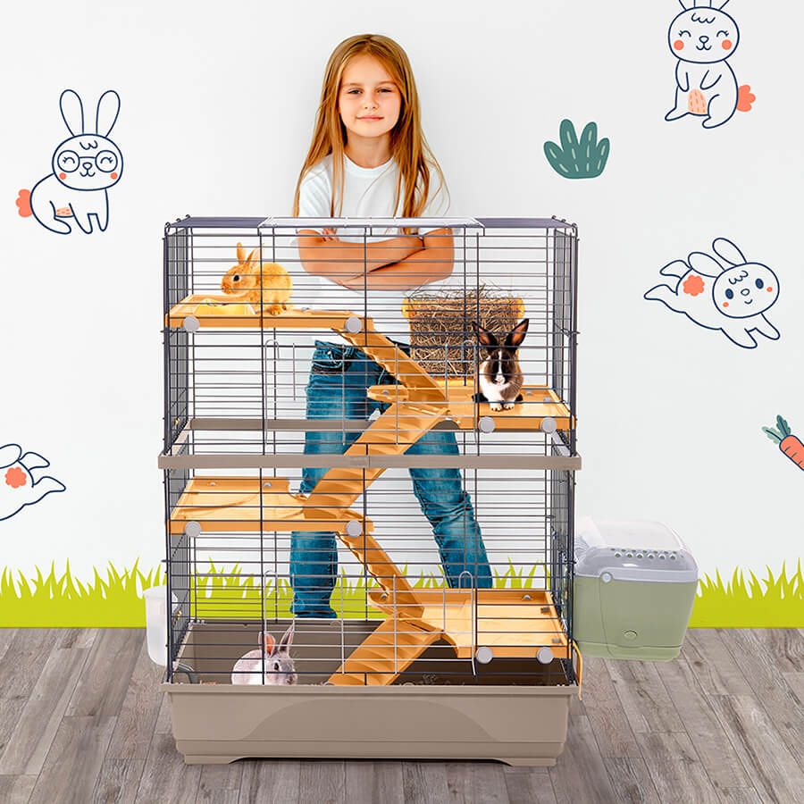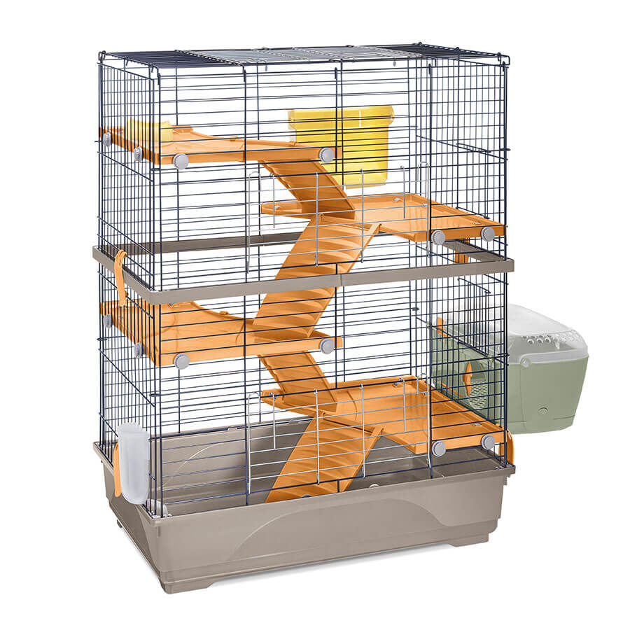 Un vero grattacielo per i vostri amici roditori, questa è la gabbia per conigli, cavie, cincillà e furetti Double 80. Ben cinque piani in plastica collegati con comode scalette ospiteranno i vostri animaletti, creando così varie aree specifiche per le diverse attività. La gabbia è composta da un capiente e robusto fondo in plastica e una struttura in rete metallica verniciata divisa in due parti unite da clip laterali. Inoltre per pulire facilmente la gabbia la struttura superiore può essere sganciata dal fondo grazie alle clip laterali. Tre ampie aperture, due sulla parte laterale e una sulla parte superiore ti permetteranno di accedere alla gabbia per inserire il cibo o per le normali operazioni di manutenzione. Collegata al primo ripiano della gabbia tramite una portina laterale abbiamo Sweet Home, la casetta per offrire al tuo roditore ancora più spazio per il suo relax. Sweet Home ha il tettuccio apribile e un cassetto estraibile per tenerla sempre pulita ed è dotata di porta di chiusura per separarla dalla gabbia. I vostri amici roditori si manterranno sicuramente in forma con questa spaziosa gabbia corredata di tutti i comfort: ciotola in plastica Fun Bowl, mangiatoia esterna per il fieno Feel e il beverino Bibber 400 con pratico aggancio alla rete. Comodissimo per questa grande gabbia è l’optional Portagabbie 80 in metallo verniciato blu, che grazie alle ruote piroettanti ti permetterà di spostarla, in totale sicurezza, da un luogo all’altro senza nessuna difficoltà. Double 80 è una gabbia facilmente assemblabile e realizzata con il sistema salva-spazio per farti risparmiare sui costi di trasporto e stoccaggio.