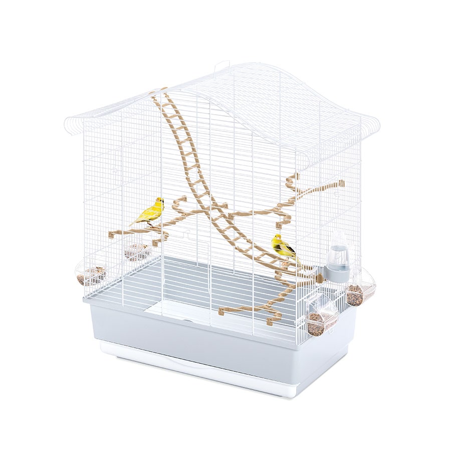 Gabbia a base rettangolare e tetto spiovente, per ospitare uccelli come canarini, cocorite e uccelli esotici. Essenziale nella forma e piacevole nel colore. Il fondo è dotato di pratico cassetto estraibile per la pulizia periodica della gabbia. All’occorrenza è possibile sganciare totalmente il fondo grazie alle comode clips laterali. La maniglia sul tetto permette di trasportare la gabbia Elettra con estrema facilità. Inoltre è corredata di tutti gli accessori necessari a garantire il massimo comfort: tre posatoi a forma di ramo, una scaletta Tibetan ladder, un beverino Tweety 100 e quattro mangiatoie Mia, realizzate in plastica trasparente che consentono di tenere sotto controllo il livello di cibo inserito all’interno. Estremamente pratico è l’optional Portagabbie 203, che disponendo di ruote piroettanti, ti permette di spostare facilmente la gabbia dove vuoi tu.