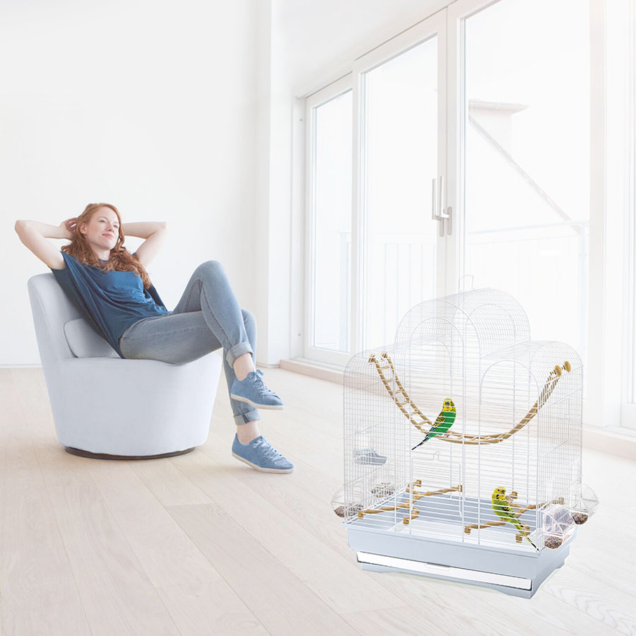 Fiona gabbia per canarini, cocorite e uccelli esotici molto bella ed elegante anche per l’abbinamento cromatico tra la rete con il colore del fondo in plastica. La forma del tetto arrotondato assicura grande comfort, spazio e libertà di movimento ai vostri amici pennuti. Fiona è completamente accessoriata infatti, le quattro mangiatoie Mia in plastica trasparente, il beverino Tweety 100, i due posatoi a forma di ramo e la scaletta tibetana, forniscono tutti i comfort per far divertire, mangiare e bere i vostri volatili. Dotata di un’apertura grande frontale e una più piccola laterale per accedere comodamente alla gabbia per le normali operazioni di manutenzione. Facile e veloce da pulire, infatti basta estrarre il cassetto e rimuovere lo sporco quotidiano. Abbina a Fiona il Portagabbie 226, per posizionare facilmente la gabbia, in ogni angolo della tua casa, grazie alle ruote piroettanti.