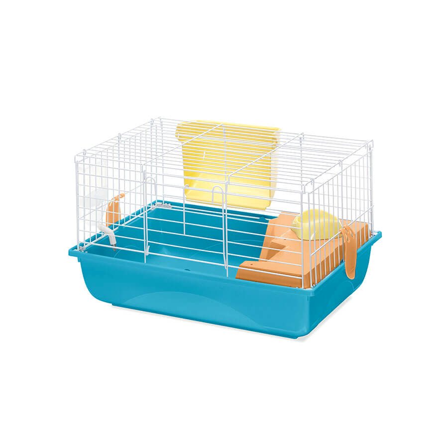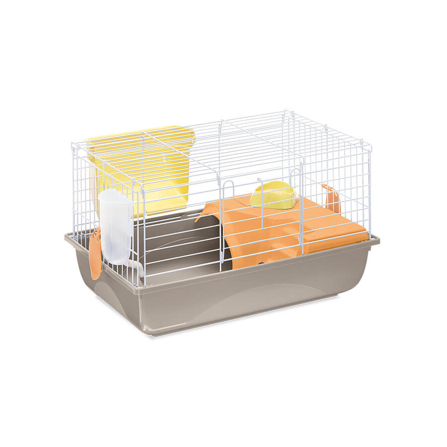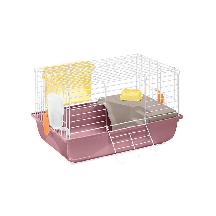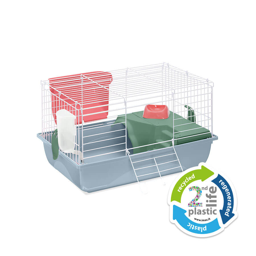 Ronny 60 è la più piccola gabbia della serie, adatta per conigli e cavie. Il capiente fondo in plastica, disponibile nei nuovi colori e nella versione Second Life Plastic, è abbinato ad una struttura in rete metallica verniciata. L’ampia porta frontale permette di accedere comodamente alla parte interna della gabbia, per inserire il cibo e per la manutenzione necessaria. Un ripiano in plastica collegato al fondo con una scaletta, permette al tuo roditore di avere più spazio per il suo divertimento e relax. Nella gabbia sono compresi la ciotola in plastica Mini Bowl, la mangiatoia esterna per il fieno Feel e il beverino Bibber 400 con pratico aggancio alla rete. L’optional Portagabbie 60 in metallo verniciato, ti permetterà di spostare la gabbia, in totale sicurezza, da un luogo all’altro senza nessuna difficoltà, grazie alle ruote piroettanti. Ronny 60 è una gabbia facilmente assemblabile e realizzata con il sistema salva-spazio per farti risparmiare sui costi di trasporto e stoccaggio.